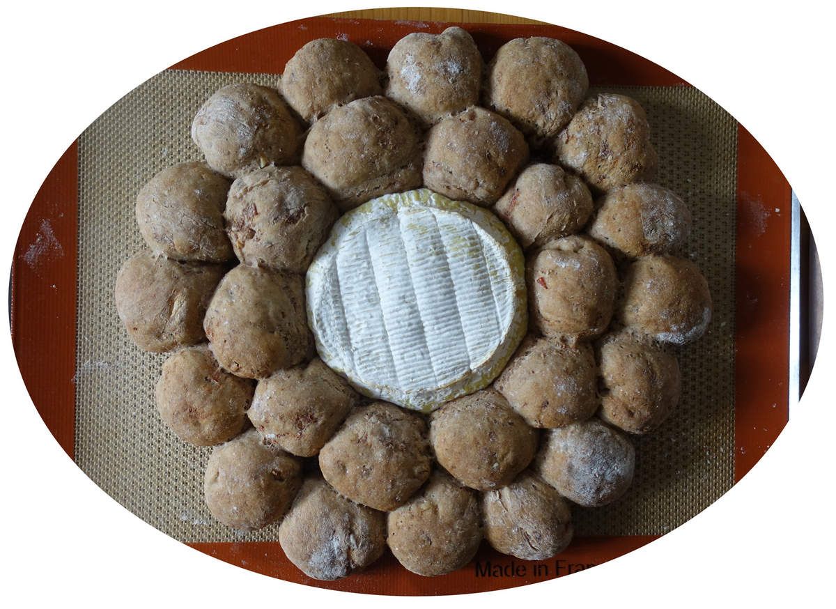 4. Fariner le plan de travail et y verser la pâte. La diviser en 26 parts à peu près égale. Former des boules avec les morceaux de pâte et les répartir autour du camembert. Couvrir avec un torchon puis laisser encore lever 1/2h à 1h.